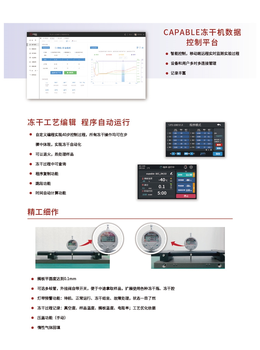 ●先进的TPIN (FD-1060)冻干专用控制系统,配合共品点测量、样品温度、真空度实时检测,保证冻干质量