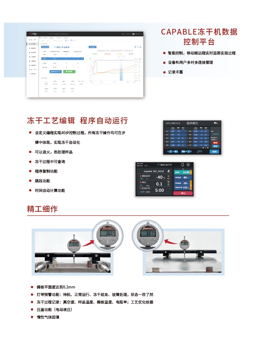 ●先进的TPIN (FD-1060)冻干专用控制系统,配合共晶点测量、样品温度、真空度实时检测,助力冻干工艺的研发