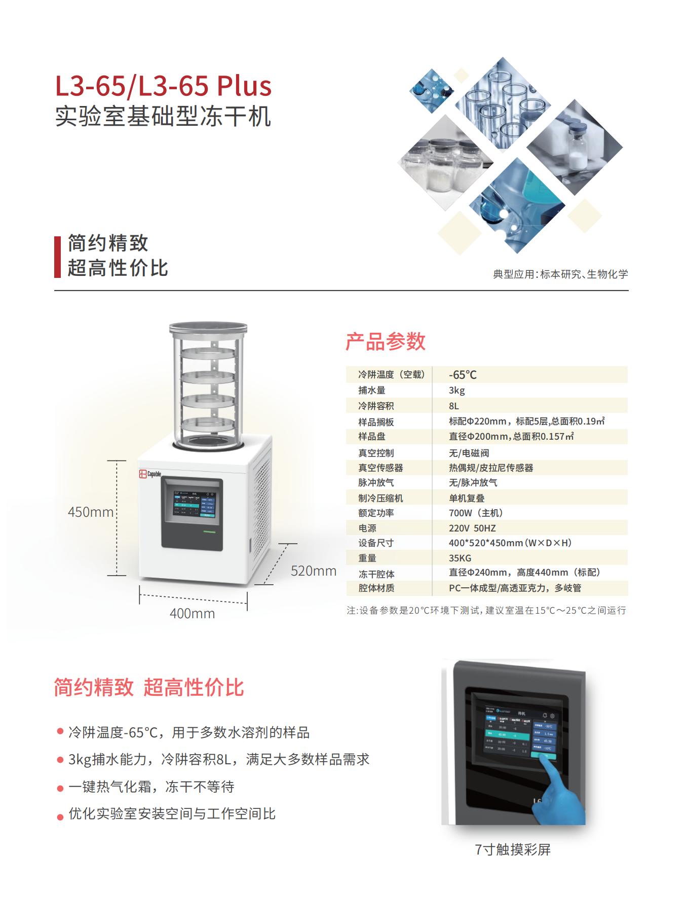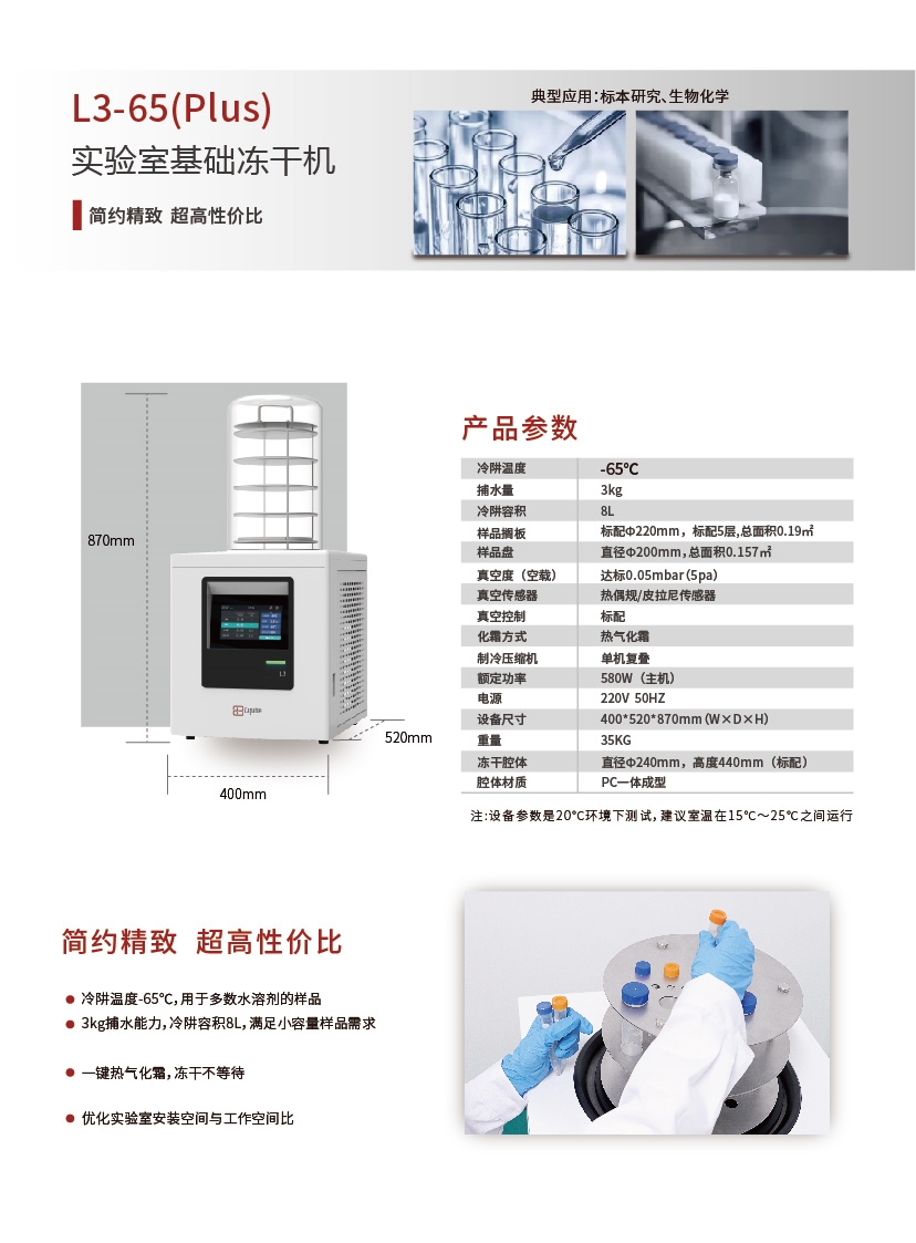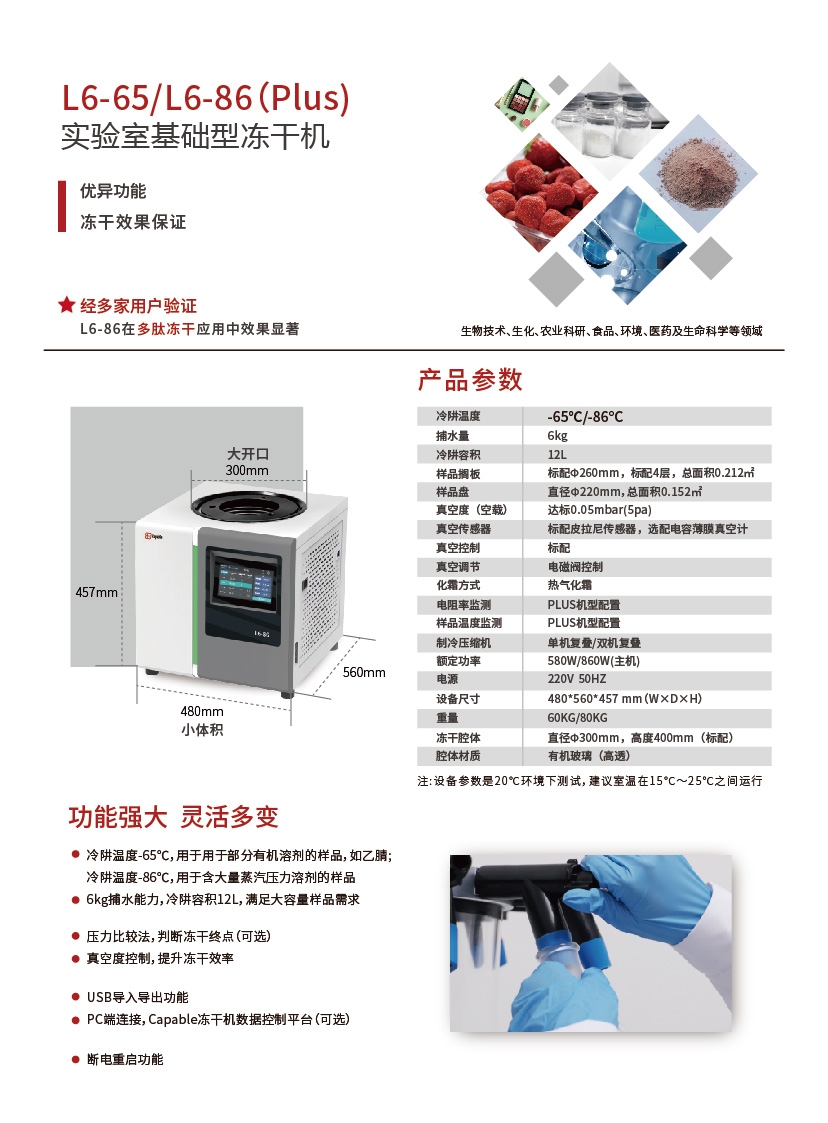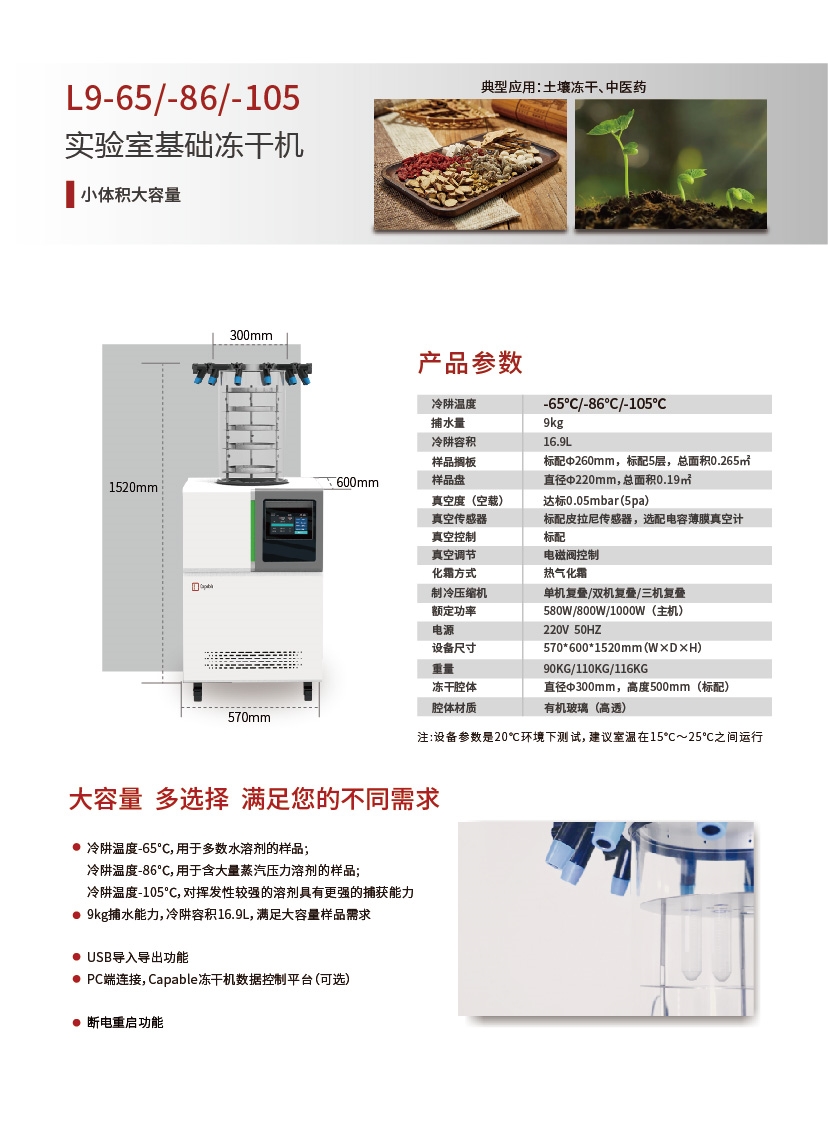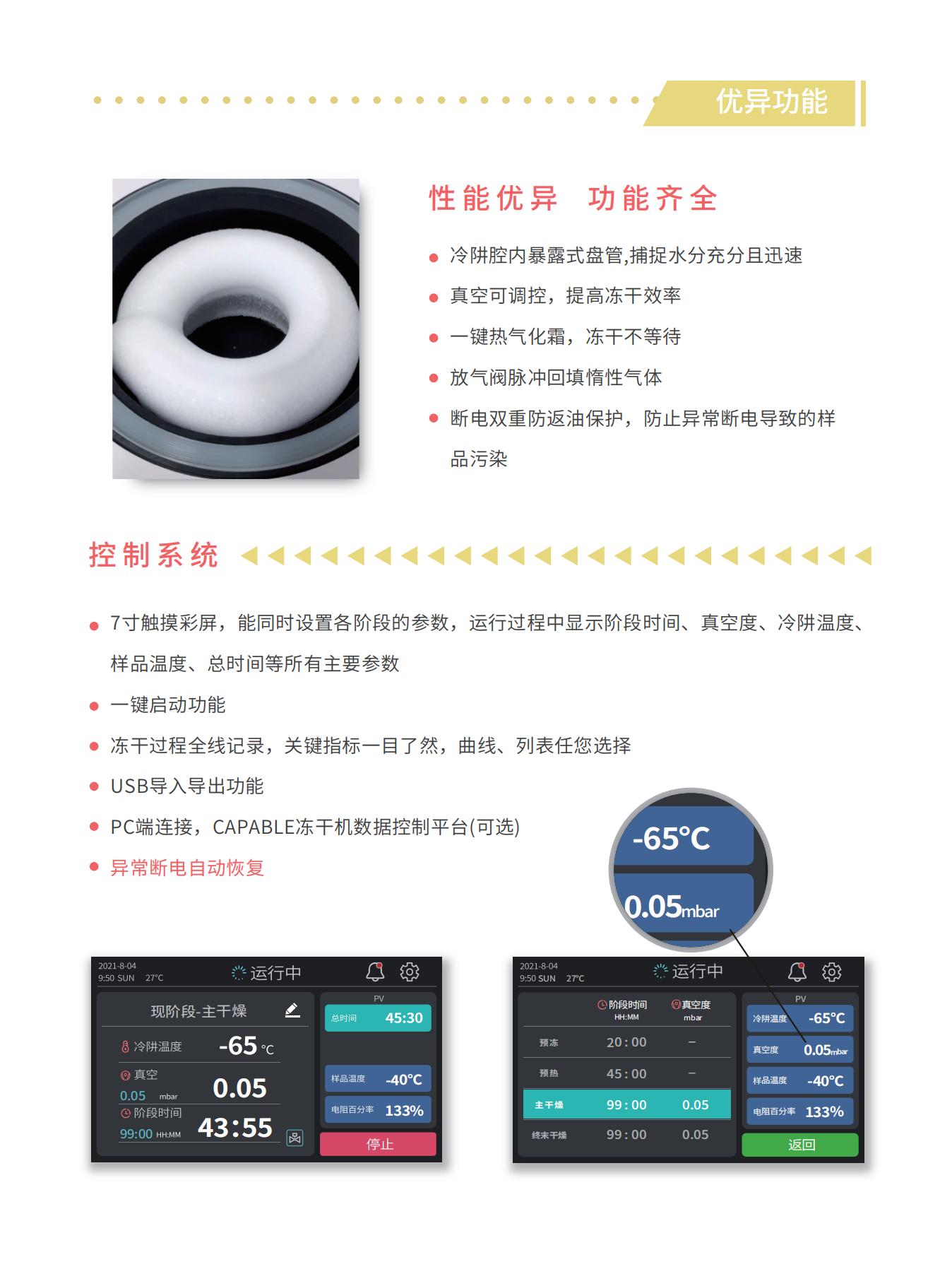 1、冷阱温度-65℃,满足实验室基础冻干需求,适合水凝胶、气凝胶、中药、土壤、蛋白等水溶剂冻干